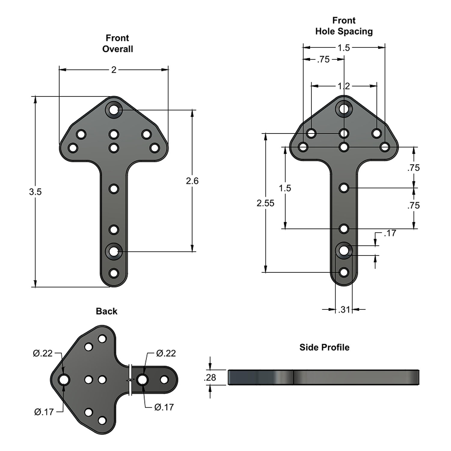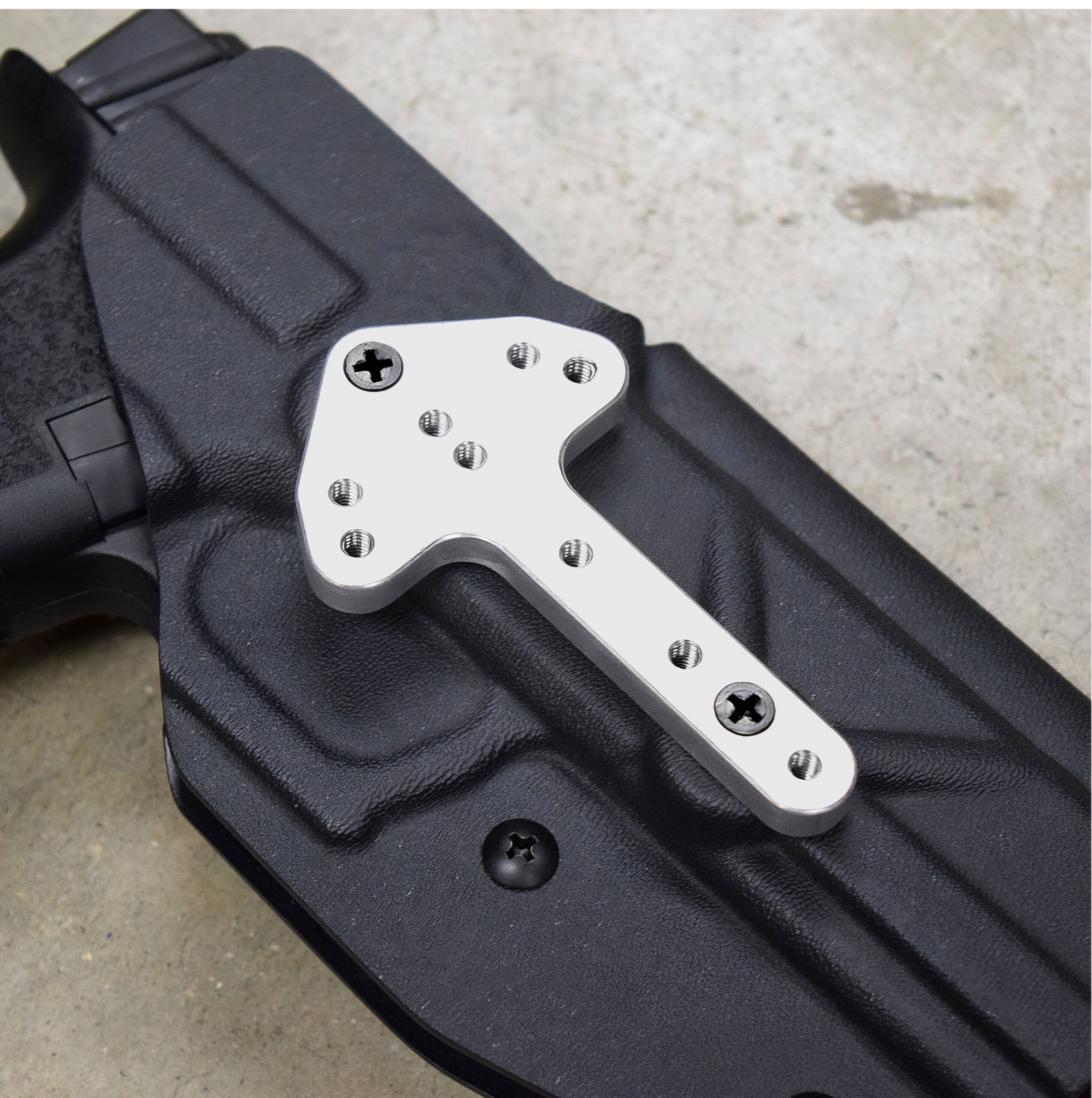 Holster Mounting Plate (HMP) in a Tumbled Aluminum finish. The HMP is an universal holster attachment mounting system that allows for the ability to swap mounts quickly without fumbling with the posts on the inside of the holster. It attaches to the holster using two mounting points that are 2.60 inches apart. The Holster Mounting Plates has nine attachment points that accommodate for industry standard hole spacing in common holster attachments (Blackhawk, Bladetech, G-Code, Safariland, BOSS, and etc.) and allows for custom attachment positioning. Those holes are threaded for direct mounting with 8-32 screws. These attachment points feature more thread contact for your mount screws, providing stronger and longer lasting connections.