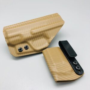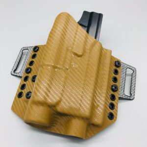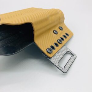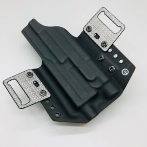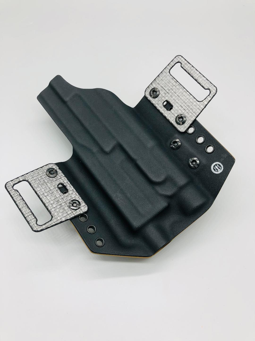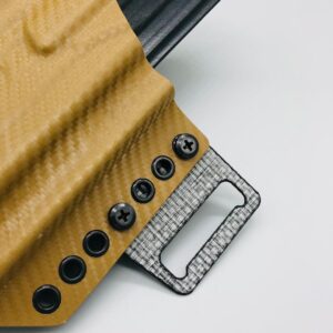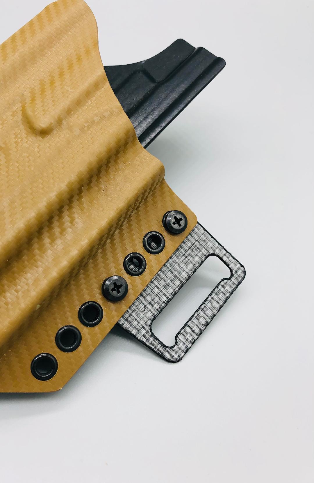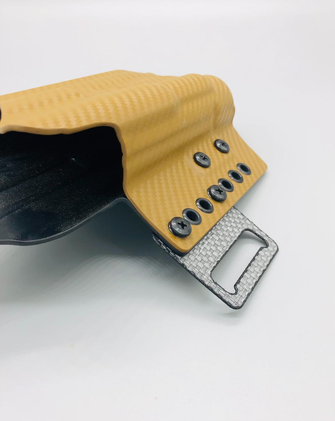 Laser Cut Tegris OWB Belt Loops. Made of an alternative to carbon fiber. Material is made of woven fabric after pressing polypropylene film into a tape yarn. Allowing for some of the strongest most flexible material available.