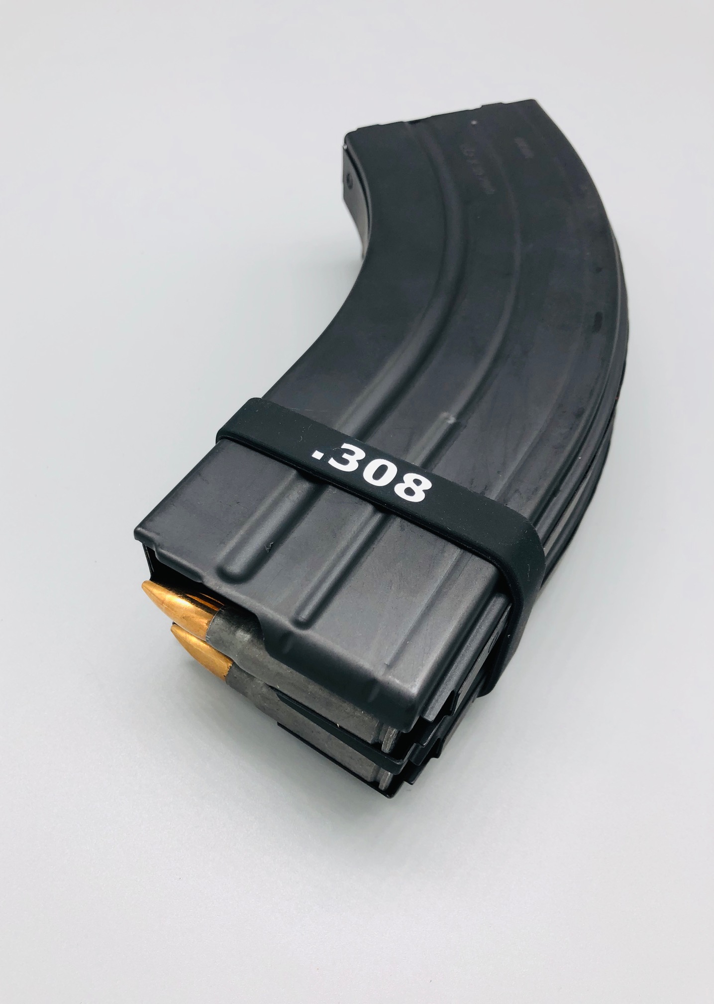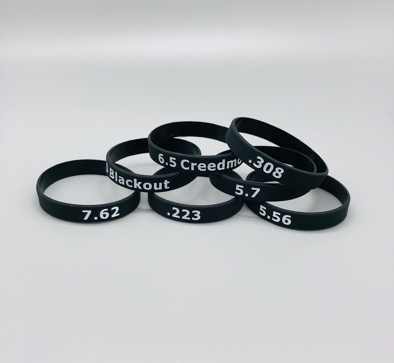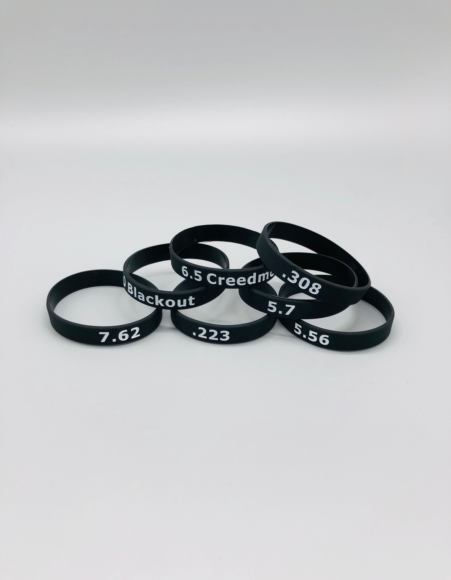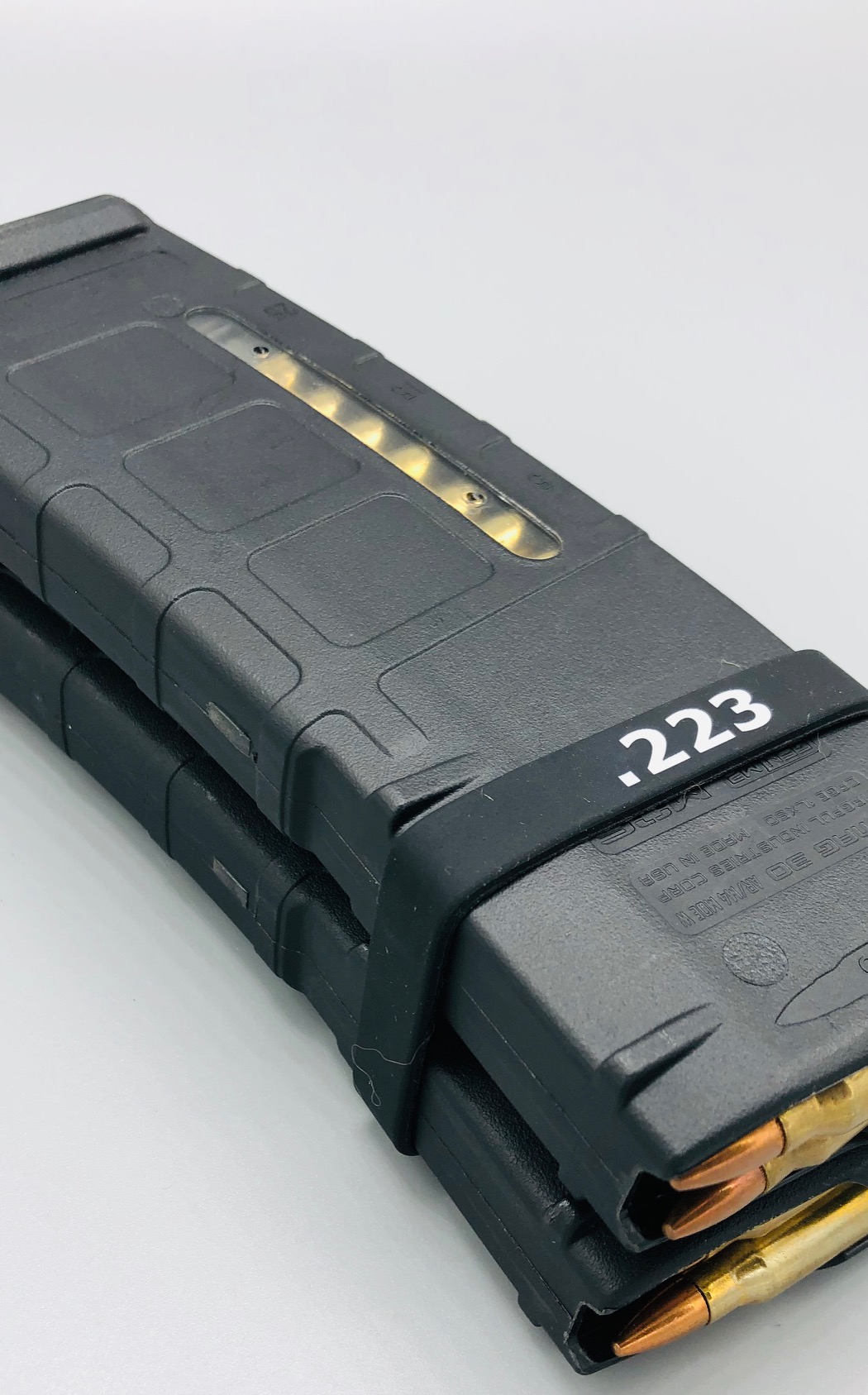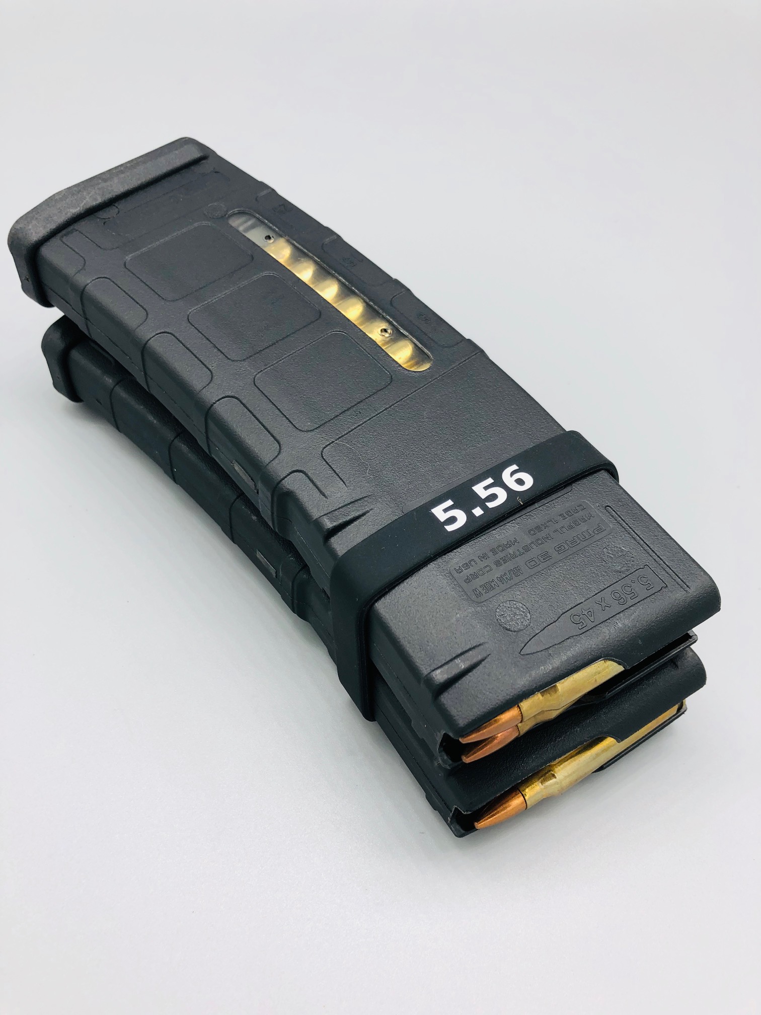Mag ID bands. Identify your mags by caliber or wear on your wrist. These larger silicone bands will fit around 2 standard sized mags or a reasonable sized wrist. Larger bolt action calibers ( ie. 7.62, Creedmoor, etc.) may fit around 1 mag. See corresponding pictures. The bands are Black and have lettering/numbering that is recessed and filled in with white ink.