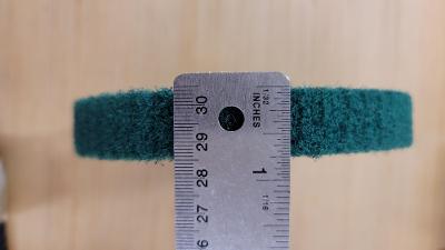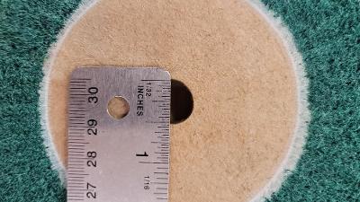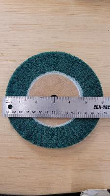 Sized 6 x .75 x .5 used on a standard 6″ buffer from Harbor Freight. They can be squared up every 40-60 holsters or so by using a standard belt sander to flatten the wheel evenly. Material is best described in texture to that of a green brillo pad you would normally use for dishes.