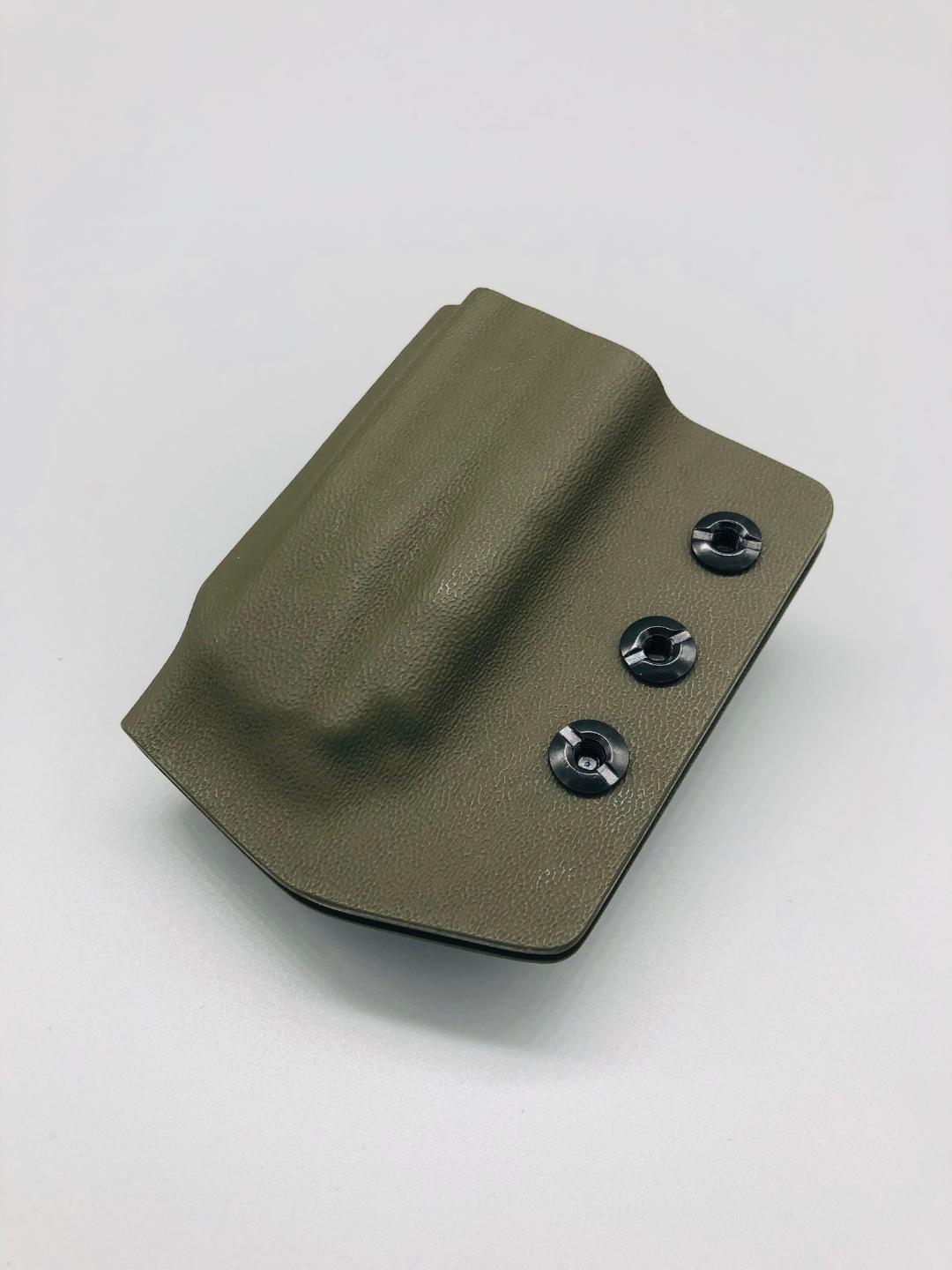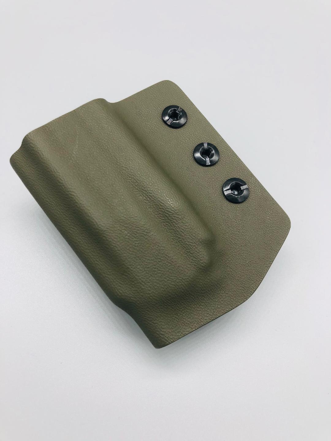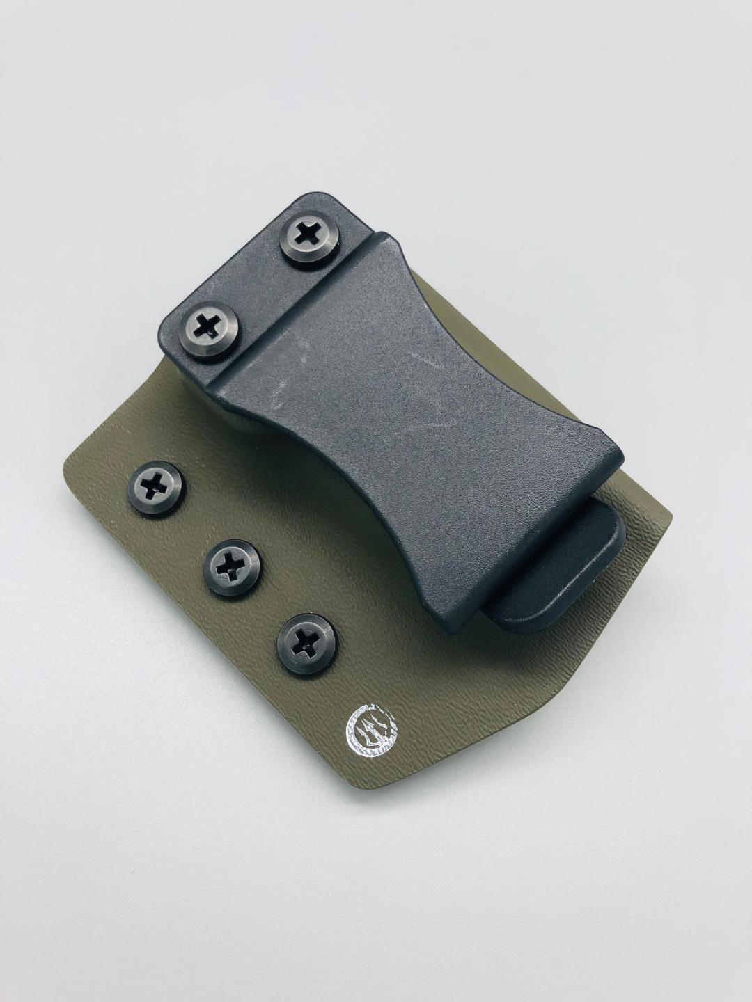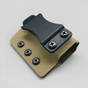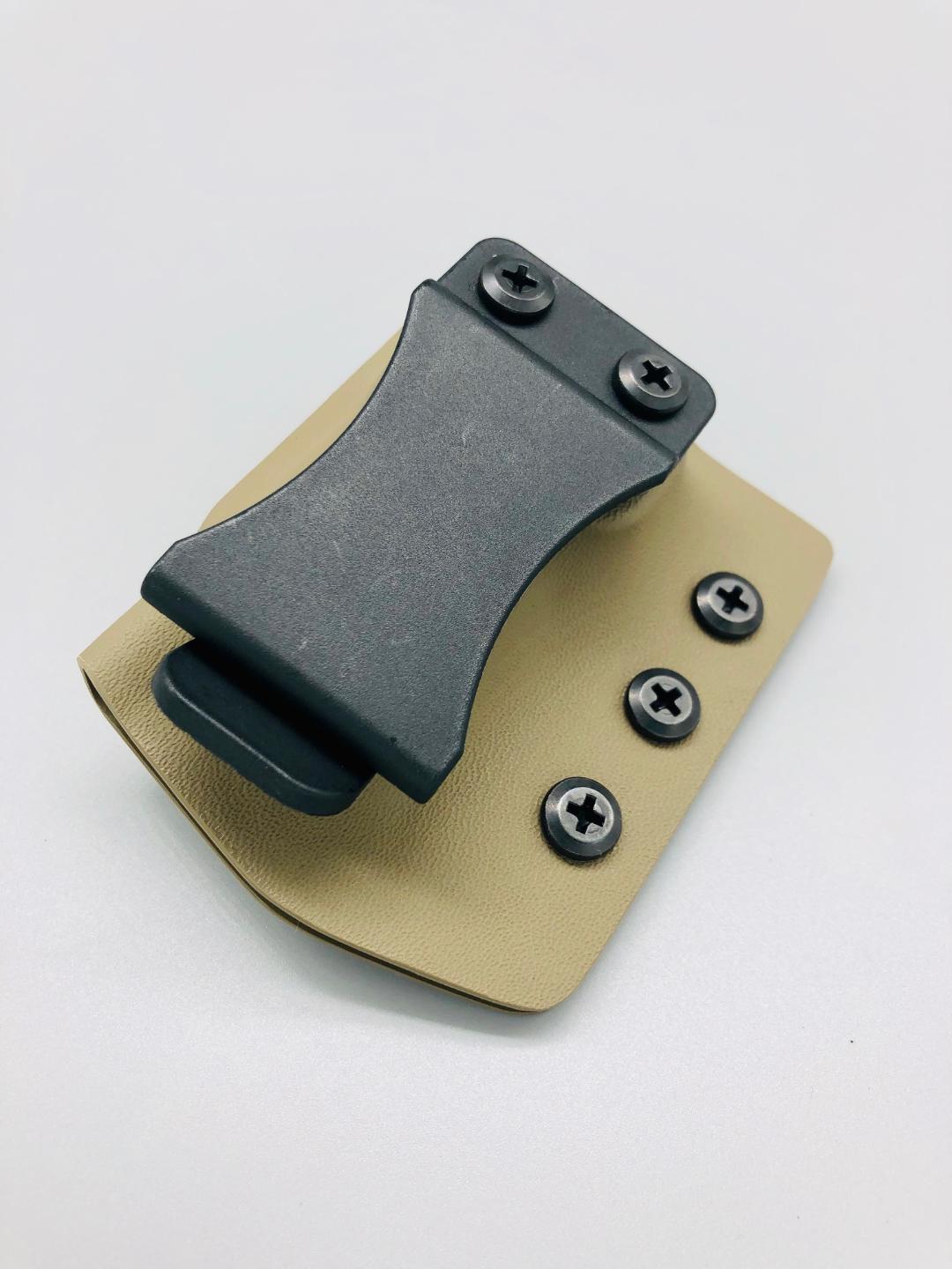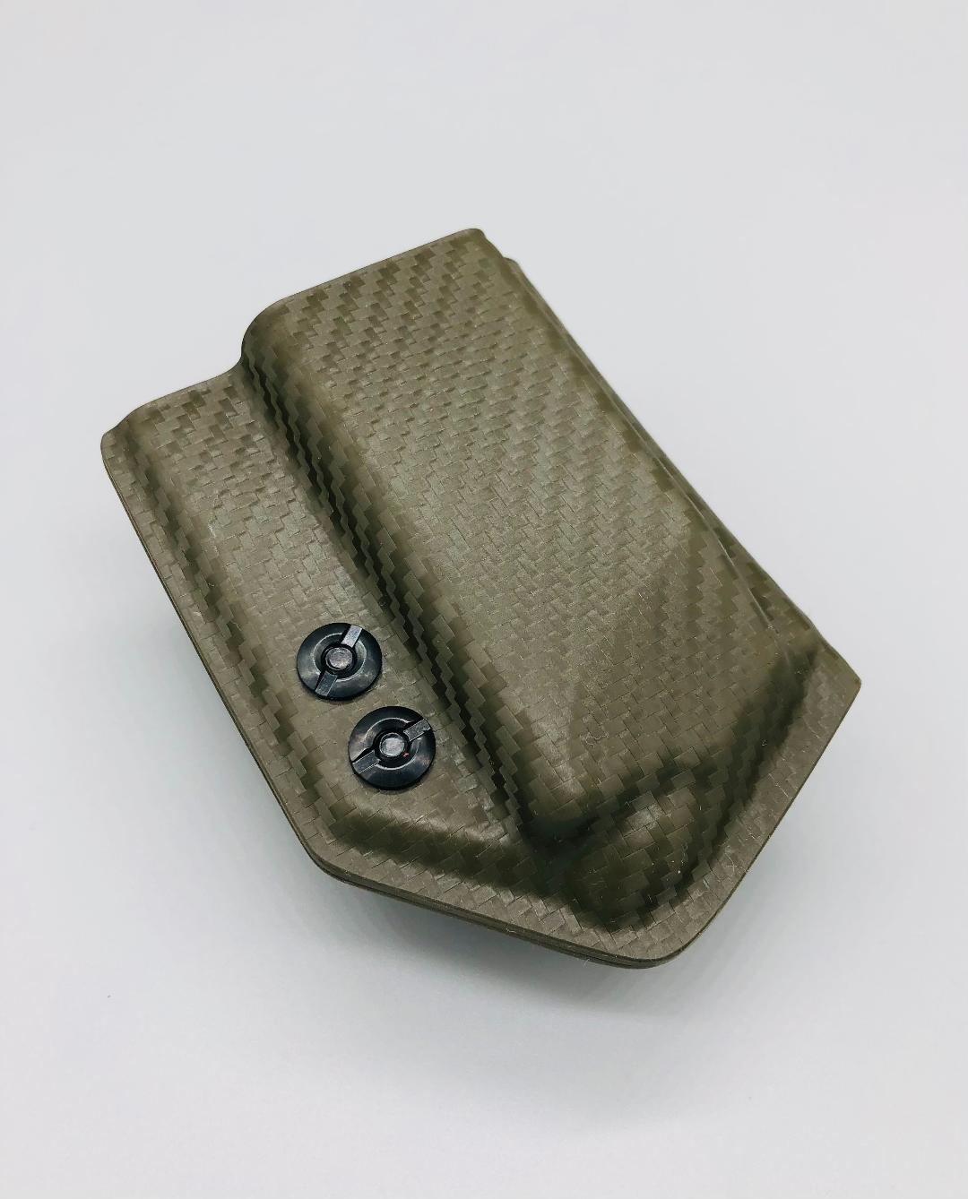 Single mag pouch for inside the waistband. The custom and handmade kydex magazine pouch comes in a variety of colors and models. Includes Fomi clip for inside the waistband carry. Made in the USA.