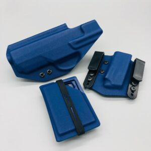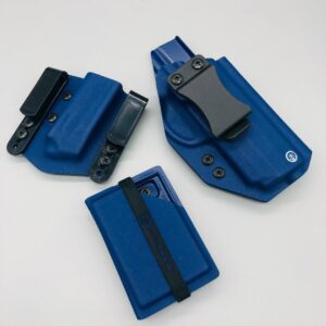 Bundle deal with Triton Series holster (inside the waistband) with single magazine magazine pouch and matching kydex wallet. Your choice of many colors as well as three adjustable clip options for your holster. Wallet has a clip option for inside the waistband carry as well. Please contact us about any additional models not seen in the drop down list. Other models are available. Handmade in the USA.